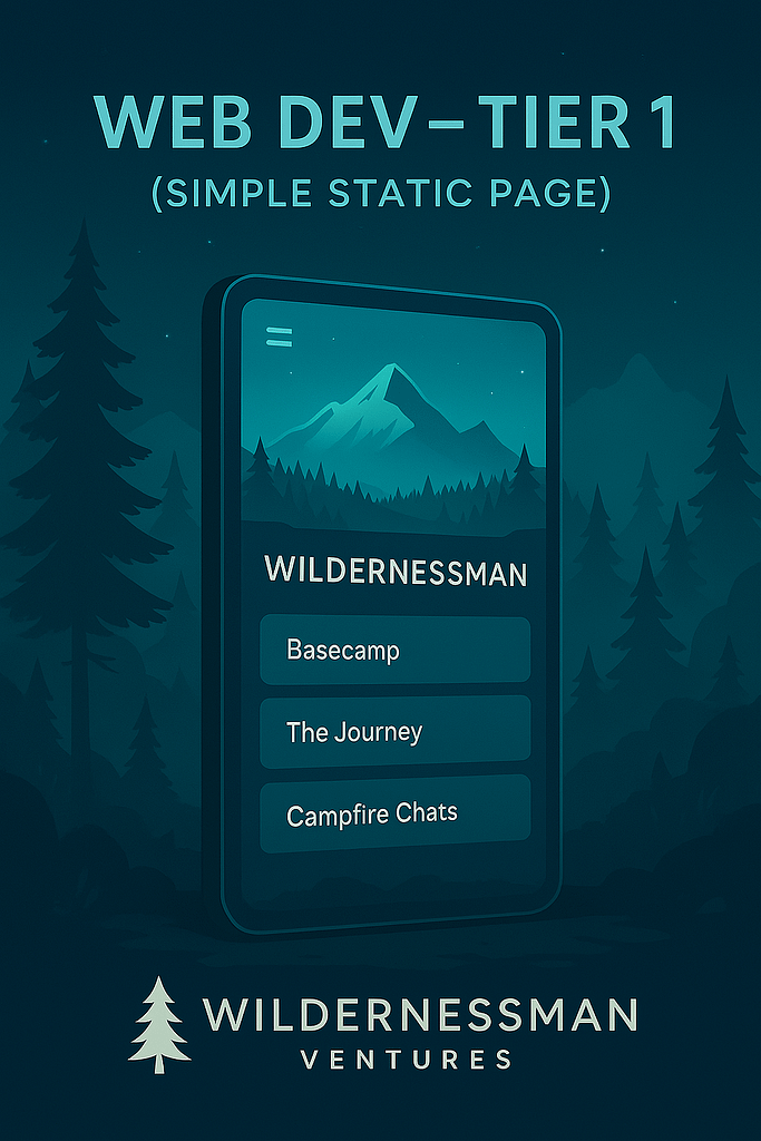 Description: A professional landing page to establish your online presence, hosted on a wildernessmanventures.com subdomain (e.g., yoursite.wildernessmanventures.com). Custom domain upgrade available for an additional $50 setup fee (domain purchase not included). Includes access to my Discord or Telegram community for support.